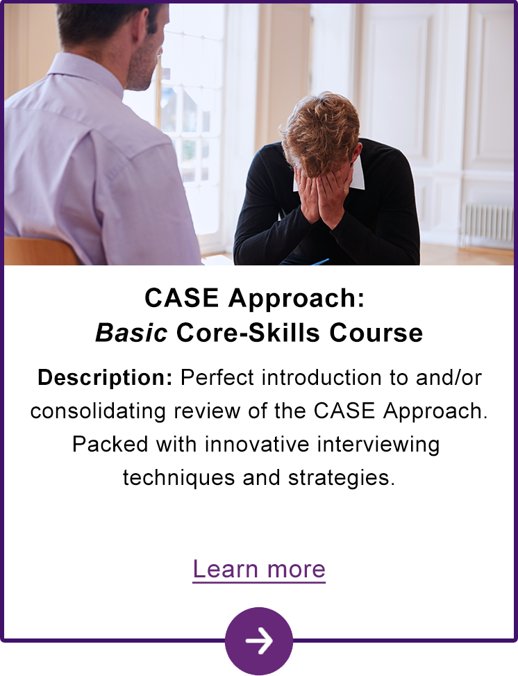 The CASE Approach is an easily learned interviewing strategy for uncovering suicidal ideation, planning, behaviors and intent. When using the CASE Approach, clinicians flexibly interweave innovative techniques from the field of clinical interviewing - known as Validity Techniques-