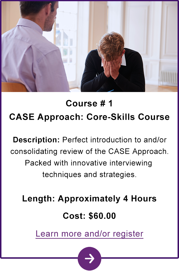 The CASE Approach is a flexible, practical, and easily learned interviewing strategy for uncovering suicidal ideation, planning, and intent. It is designed to increase validity, decrease errors of omission, and increase the client’s sense of safety with the interviewer. The interviewing
