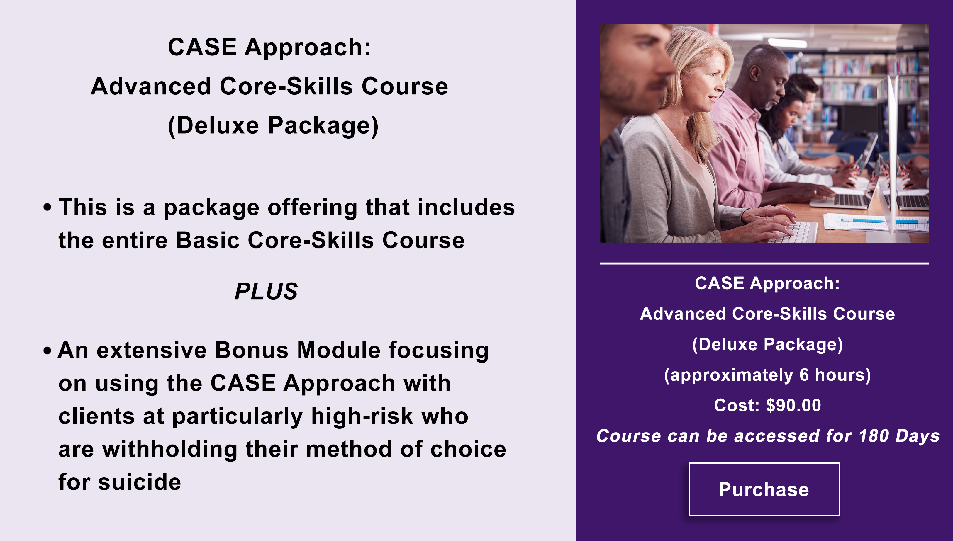 For participants already familiar with the CASE Approach, this package (which includes the entire Core-Skills Course with extensive expansions of all of its annotated answers) serves as an outstanding avenue for consolidating and deepening the participants understanding of how to effectively use the CASE Approach. The participant's clinical skills are then taken to an even higher level of expertise provided by the addition of the completely new Bonus Module and videos on interviewing clients at particularly high risk.